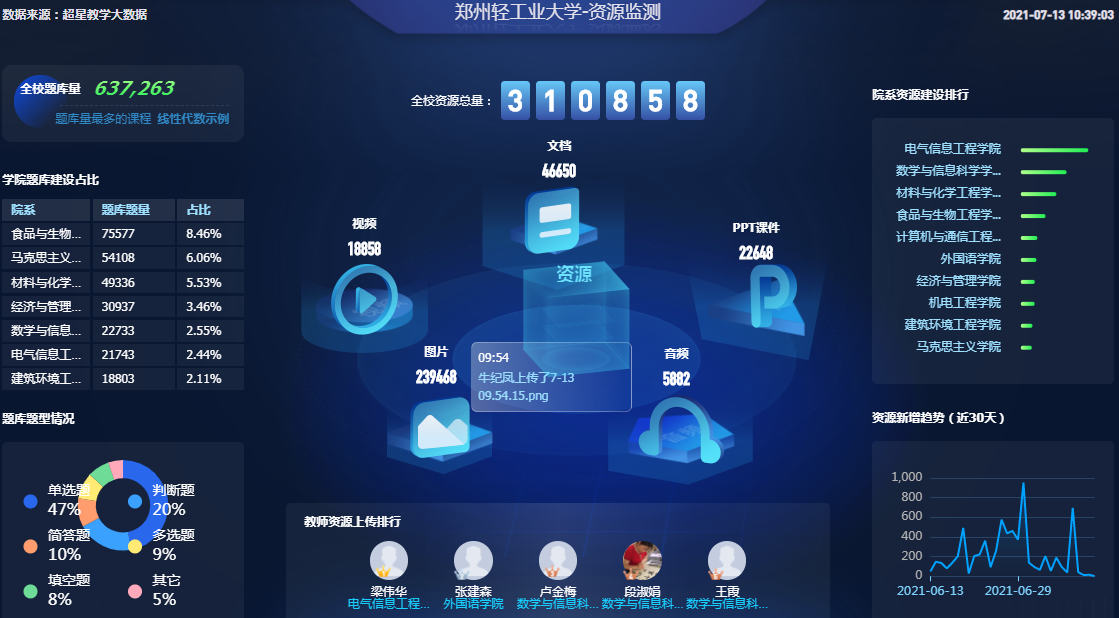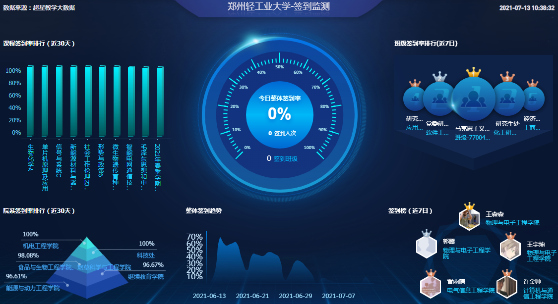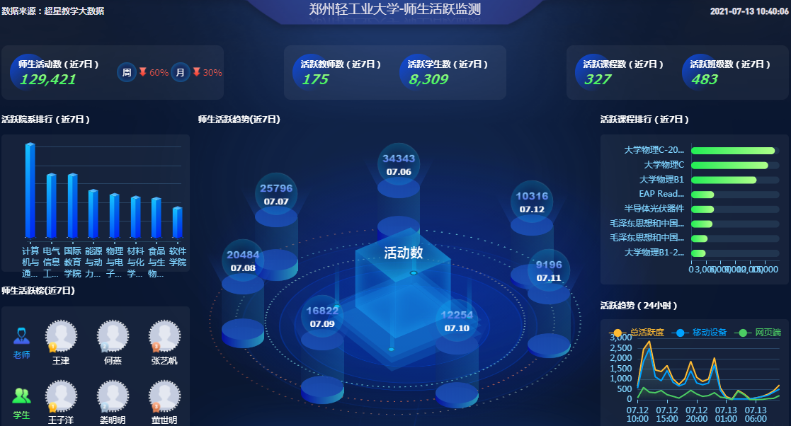 为协助线上教学顺利开展,协助管理部门做好教学工作统计,一平三端超星智慧教学系统推出日报、周报、月报以及大数据质量监控用于管理部门随时掌握学校教学情况。
