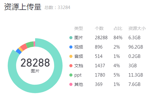 课程资源类型为视频、文档、图片、音频、动画等资源,自使用以来,单位存储总量13998GB。