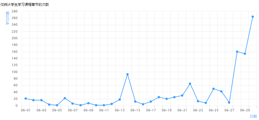 教师在课程中,通过将教学内容(如视频、测验、文档等)设为任务点的形式,用于统计学生的完成情况,便于查看学习进度。由图可知,3月进入教学高峰期,学生学习进度有加快趋势。