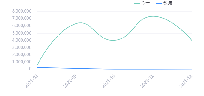 在线教学以班级的形式开展,教学班级运行情况如下,其中8月份运行班级数量最多。后续会随着教师的教学方式、教学进度而变化。