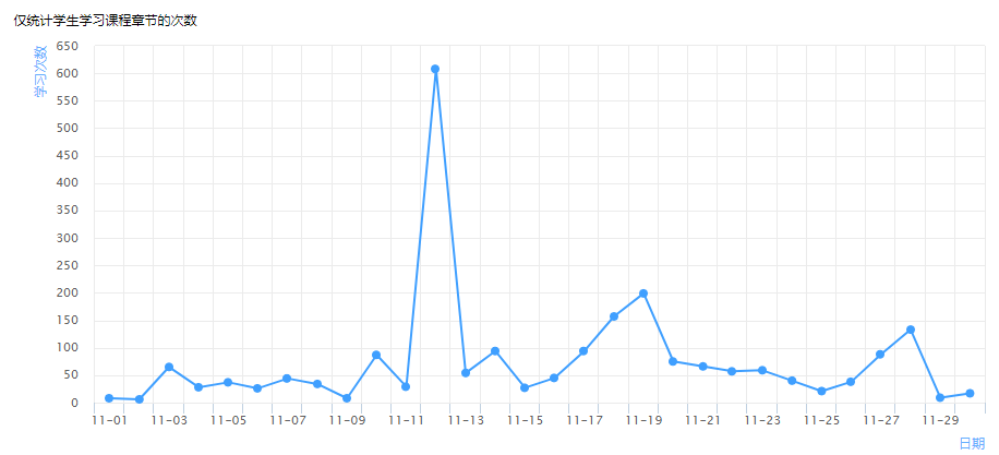 线上教学,可以通过发布签到、抢答、分组任务、讨论等课堂活动让师生以及生生之间积极参与教学互动。本学期讨论情况如下,其中9月份活动最多,后续趋于平稳。