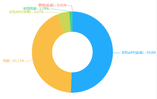 超星泛雅网络教学平台作为学校开展线上教学的主要平台,本学期新增线上课程2525门,全校运行课程4871门,其中活跃课程1998门,线上运行10301班次。本学期平台上线教学教师1482人,上线学习学生27875人。上传教学资源63189个,教师发布教学活动59.4万个,学生完成教学活动2239.7万个。教师在线教学时长达36304小时,平台访问量达5.27亿,访问设备分布情况如下: