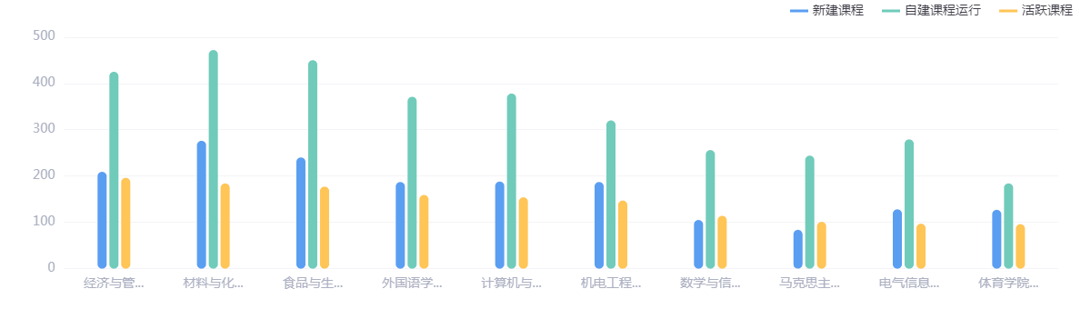 本学期新建课程2525门,自建课运行4871门,活跃课程1998门;院系课程数量情况如下: