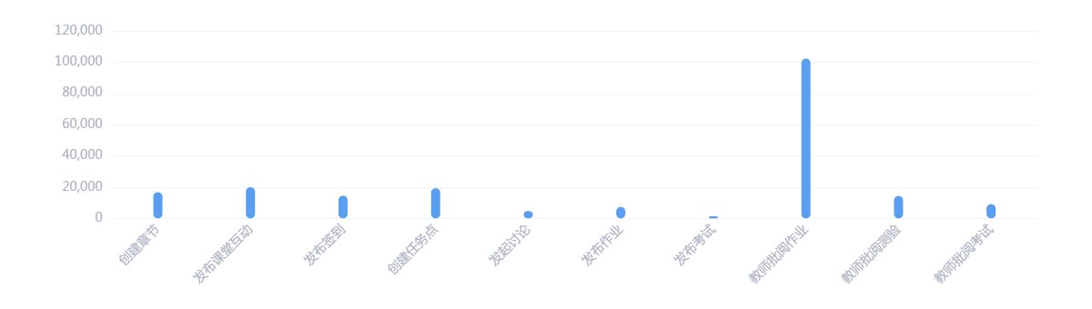 本学期平台上线教师1482人,教师活动数发布数594068。教师课堂活动发布数19933;新增任务点19349;教师发布作业数7318,批阅作业数102286;教师发布考试数1283,批阅考试数9115;教师发起讨论4724次,回复讨论1128次。