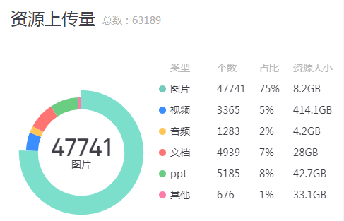 教学资源为视频、文档、图片、音频等类型资源,上传资源的类型分布情况如下:
