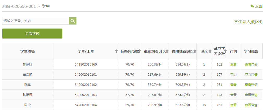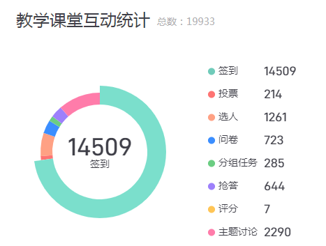 本学期共上线学生27875人,学生共完成任务点数5404756人次。学生共参活动22397221人次;学生共参与课堂活动1148957人次;学生完成作业数263842人次,完成考试数97759人次;学生发起讨论7700个,回复讨论329114个。