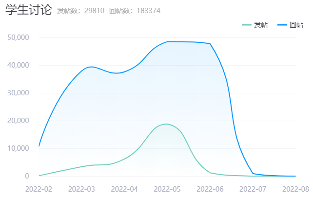 学生发帖数29810,学生回帖数183374。学生互动讨论趋势如下:
