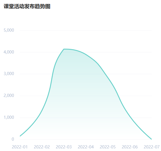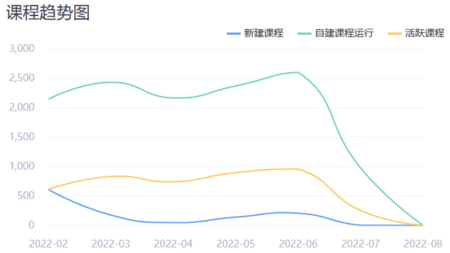 本学期课程运行整体平稳,6月份为开学初期教师需开设新课程,所以在6月份新建课程最多。贵校课程运行趋势图如下: