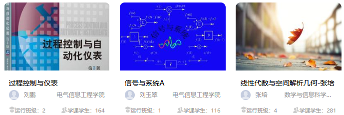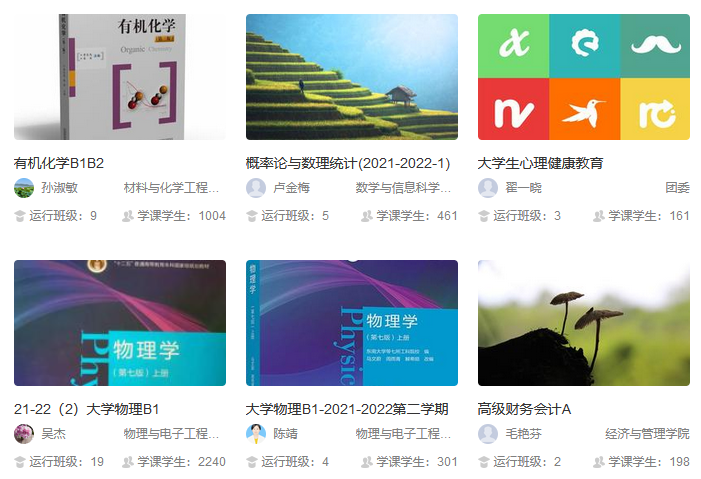 在课程运行过程中,平台根据每天运行的课程,将课程内有学生且访问量大于等于10的课程标记为活跃课程。活跃课程是判断贵校本学期课程持续开展教学的重要指标,贵校本学期活跃课程数量为1403门。下图为部分活跃课程展示: