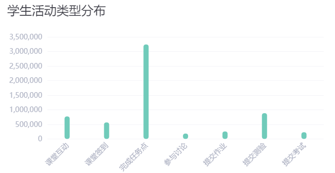 贵校学生活动类型主要为完成任务点、提交测验、课堂互动类型,学生活动类型为参与课堂互动、提交作业、考试、参与讨论等,具体的分布情况如下: