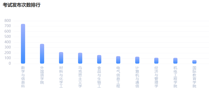 根据平台数据统计,发布考试最多的院系为数字与信息科、外国语学院,贵校发布考试数量排名前10的院系情况如下: