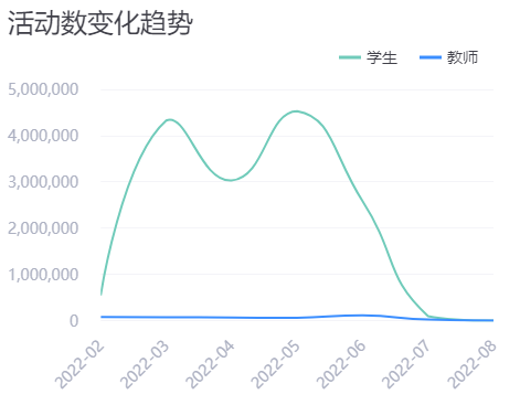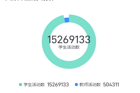 贵校师生在平台上产生的活动数据为活动数,如编辑章节、发布作业、删除考试等平台使用次数。本学期平台总活动数1577.3万次,教师活动数50.4万次,学生活动数1527.0万次。