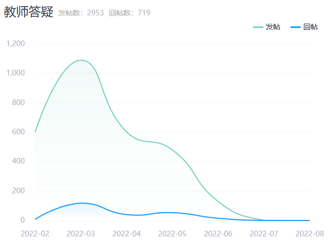 教师发起讨论2953次,回复讨论719次。教师互动讨论趋势如下: