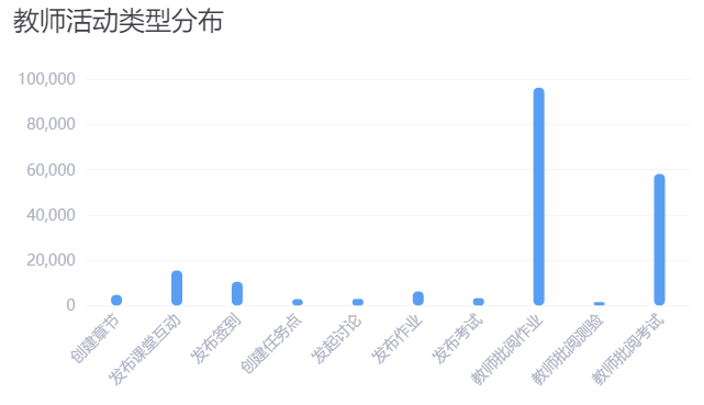 贵校教师活动类型主要在批阅作业、检测、考试、课堂互动类型。教师教学活动包括创建章节、发布作业、考试、讨论等多种教学形式。活动类型具体分布情况如下: