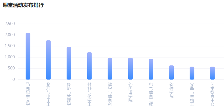 根据平台数据统计,发布课堂活动最多的院系马克思主义学院、物理与电子工,贵校发布课堂活动数量排名前10的院系情况如下: