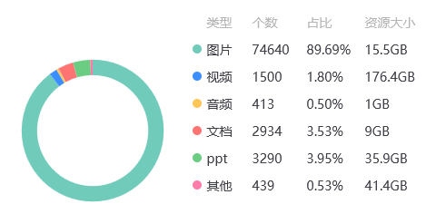 教学资源为视频、文档、图片、音频等类型资源,上传资源的类型分布情况如下: