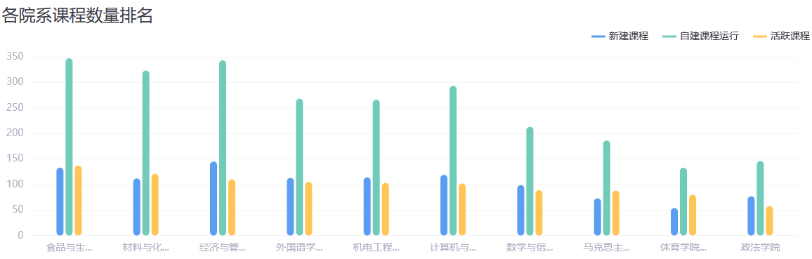 为方便贵校了解课程整体运行情况,我们将课程分为新建课程、自建课程运行、活跃课程三个类别。贵校本学期新建课程1523门,自建课运行3639门,活跃课程1403门。根据平台数据统计,本学期整体运行课程数量最多的院系为食品与生物工程学院、烟草科学与工程学院、材料与化学工程学院,贵校课程运行数量排名前10的院系情况如下: