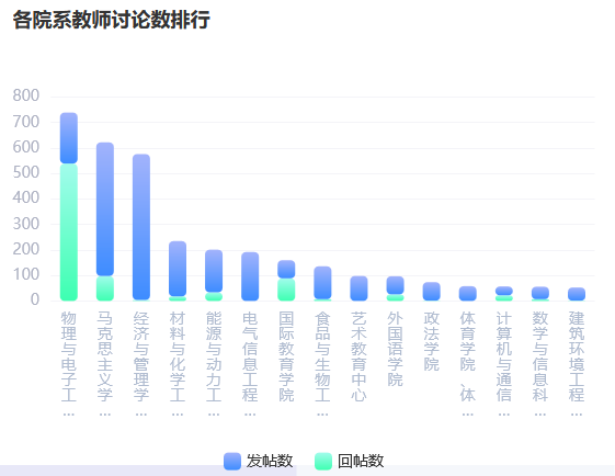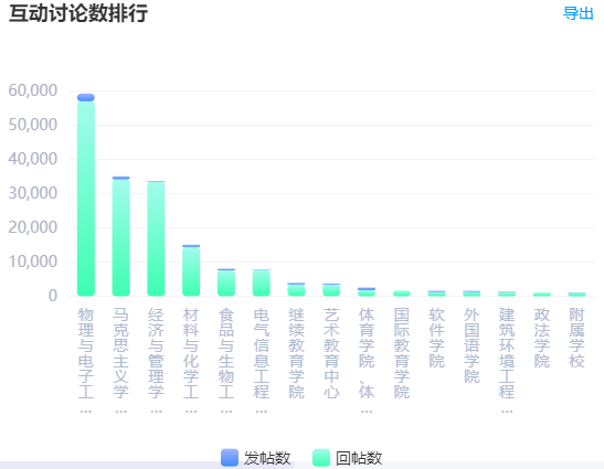 根据平台数据统计,讨论数最多的院系为文法学院、马克思主义教育学院,贵校发布讨论数量排名前15的院系情况如下: