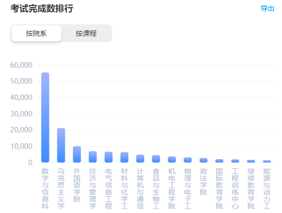 各院系学生完成考试情况,根据平台数据统计,考试完成数最多的院系为数学与信息科、马克思主义学院,贵校考试完成数排名前15的院系情况如下:
