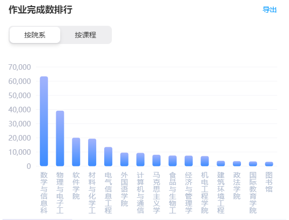 各院系学生完成作业情况,根据平台数据统计,作业完成最多的院系为数学与信息科学院、物理与电子工,贵校作业完成数前15的院系情况如下: