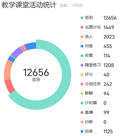 线上教学教师可通过发布课堂活动用于辅助教学,课程活动类型包括签到、投票、选人等多种课堂互动活动。贵校本学期累计开展活动19505次,具体课堂活动类型分布如下: