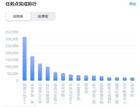 贵校各院系学生任务点完成相差较大,根据平台数据统计,任务点完成最多的院系为物理与电子工、体育学院,贵校学生完成任务点数量排名前15的院系情况如下: