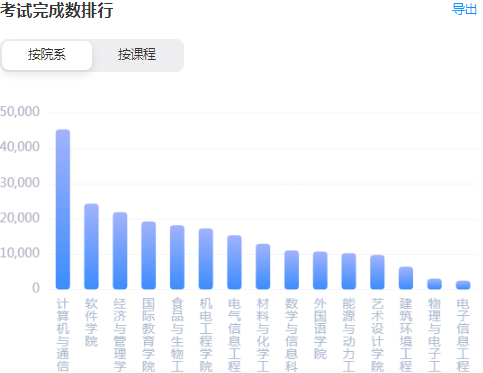 各院系学生完成考试情况,根据平台数据统计,考试完成数最多的院系为计算机与通信工程学院、软件学院,贵校考试完成数排名前15的院系情况如下:
