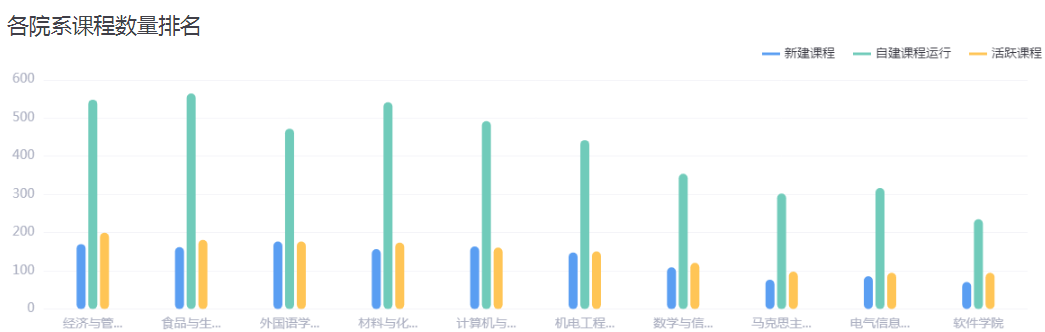 为方便贵校了解课程整体运行情况,我们将课程分为新建课程、自建课程运行、活跃课程三个类别。贵校本学期新建课程1841门,自建课运行6056门,活跃课程2018门。根据平台数据统计,本学期整体运行课程数量最多的院系为经济与管理学院、食品与生物工程学院、烟草科学与工程学院,贵校课程运行数量排名前10的院系情况如下: