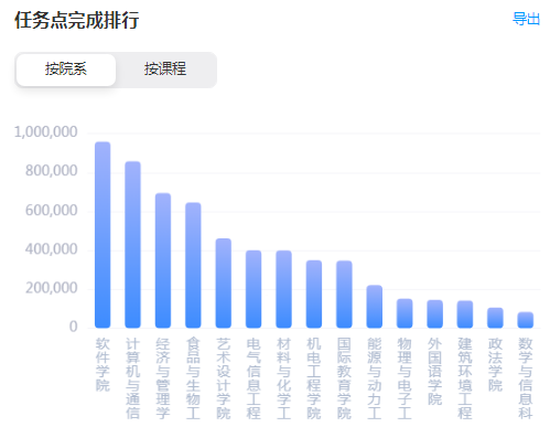 贵校各院系学生任务点完成相差较大,根据平台数据统计,任务点完成最多的院系为软件学院、计算机与通信工程学院,贵校学生完成任务点数量排名前15的院系情况如下: