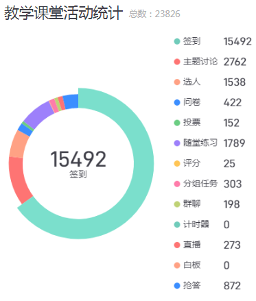 线上教学教师可通过发布课堂活动用于辅助教学,课程活动类型包括签到、投票、选人等多种课堂互动活动。贵校本学期累计开展活动23826次,具体课堂活动类型分布如下: