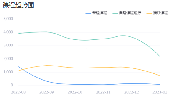 本学期课程运行整体平稳,9月份为开学初期教师需开设新课程,所以在9月份新建课程最多。贵校课程运行趋势图如下: