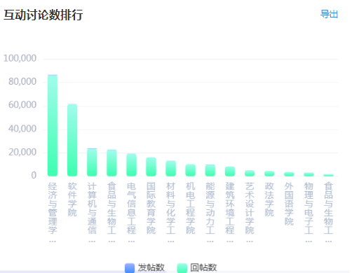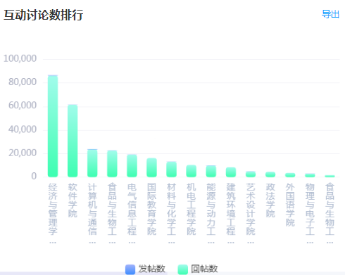 根据平台数据统计,讨论数最多的院系为经济与管理学院、软件学院,贵校发布讨论数量排名前15的院系情况如下: