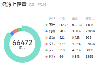 教学资源为视频、文档、图片、音频等类型资源,上传资源的类型分布情况如下: