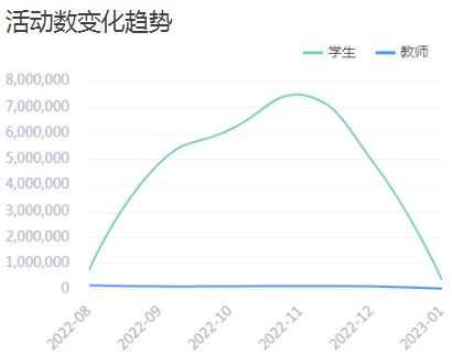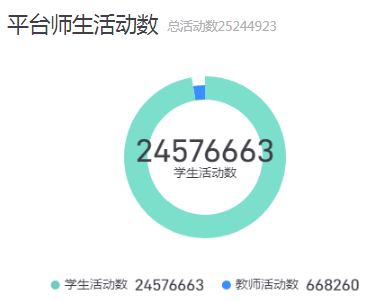 贵校师生在平台上产生的活动数据为活动数,如编辑章节、发布作业、删除考试等平台使用次数。本学期平台总活动数2524.4万次,教师活动数6.6万次,学生活动数2457.6万次。