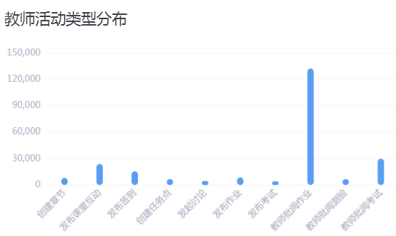 贵校教师活动类型主要在批阅作业、批阅考试、课堂互动类型。教师教学活动包括创建章节、发布作业、考试、讨论等多种教学形式。活动类型具体分布情况如下:
