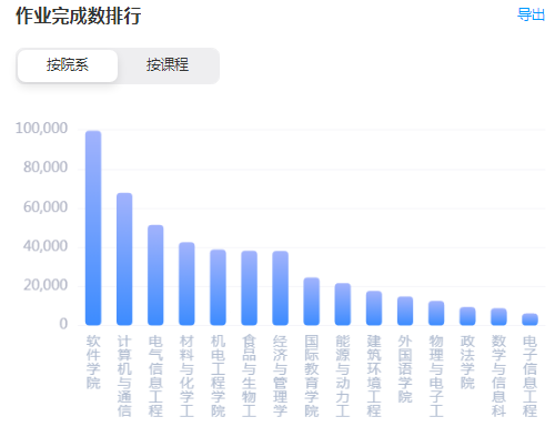 各院系学生完成作业情况,根据平台数据统计,作业完成最多的院系为软件学院、计算机与通信工程学院,贵校作业完成数前15的院系情况如下: