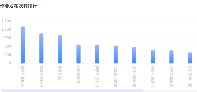 根据平台数据统计,发布作业最多的院系为数学信息与科学学院、材料与化学工程学院,贵校发布作业数量排名前10的院系情况如下: