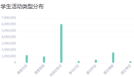 贵校学生活动类型主要为完成任务点、提交测验、课堂互动类型,学生活动类型为参与课堂互动、提交作业、考试、参与讨论等,具体的分布情况如下: