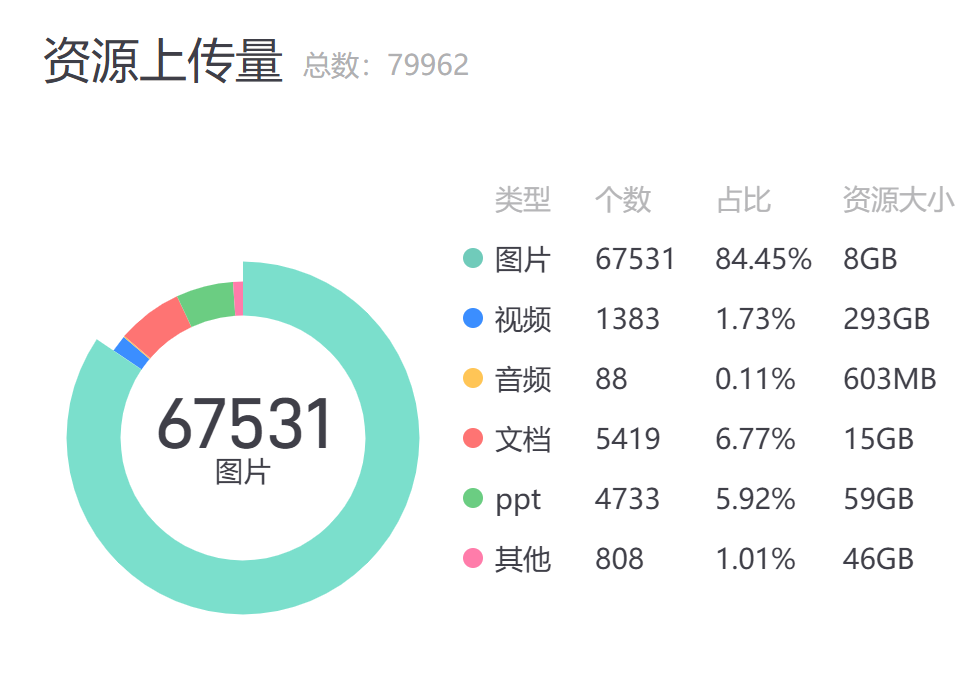 教学资源为图片、视频、音频、Word、PDF、PPT、Excel等类型资源,上传资源的类型分布情况如下:
