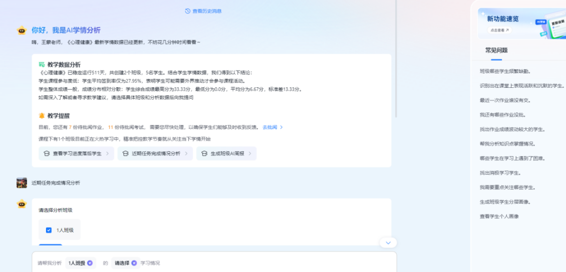 融合AI与大数据技术深化学情分析,为精准教学与科学评价提供数据支撑。突破传统学情统计局限,从任务完成情况、知识点掌握程度、互动参与表现、答题思路偏好等多维度采集数据,生成个性化学情报告与班级整体分析报告。针对学生群体,提供学情预警服务,对学习滞后、成绩波动较大的学生及时提醒,助力教师精准帮扶;针对教学环节,提供教学优化建议,为教师调整教学方案、提升教学质量提供依据,推动教学质量持续提升。