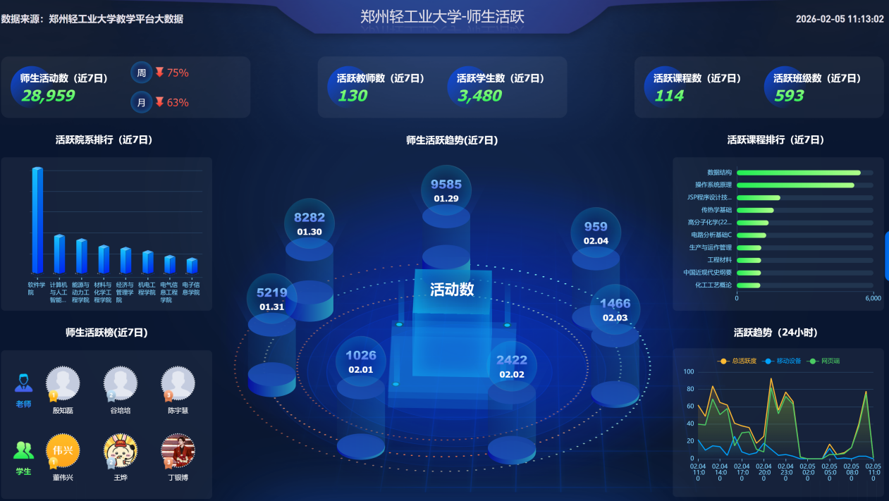 贵校教学平台大数据在整体概况、资源建设、课堂活动监测、师生活跃监测展示如下: