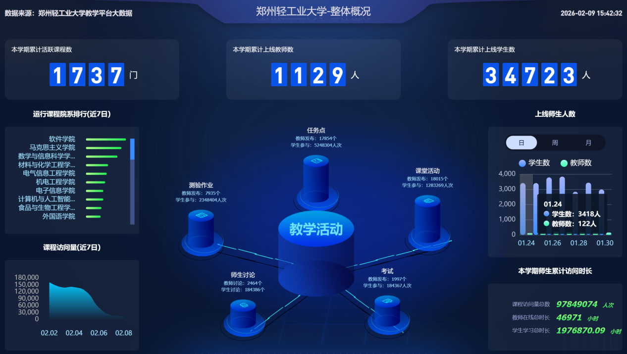 在2025年秋季教学期间,贵校全校运行课程8540门,其中活跃课程1737门,线上运行9496班次,全校累计建设课程15521门。本学期平台上线教师1119人,上线学生34720人。教师上传教学资源8万个,创建题目22万道。教师活动数72.2万次,学生活动数1497万次。教师在线教学时长达4.7万小时,学生学习时长197.7万小时,平台访问量达4.85亿次。