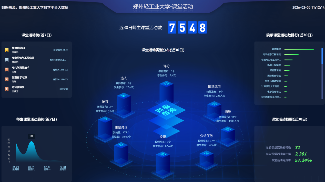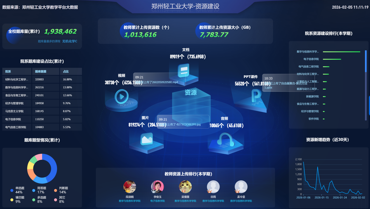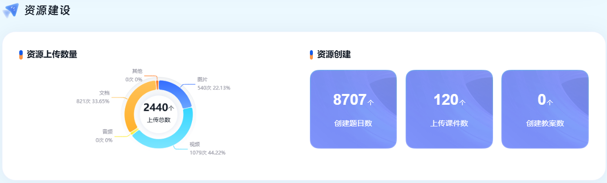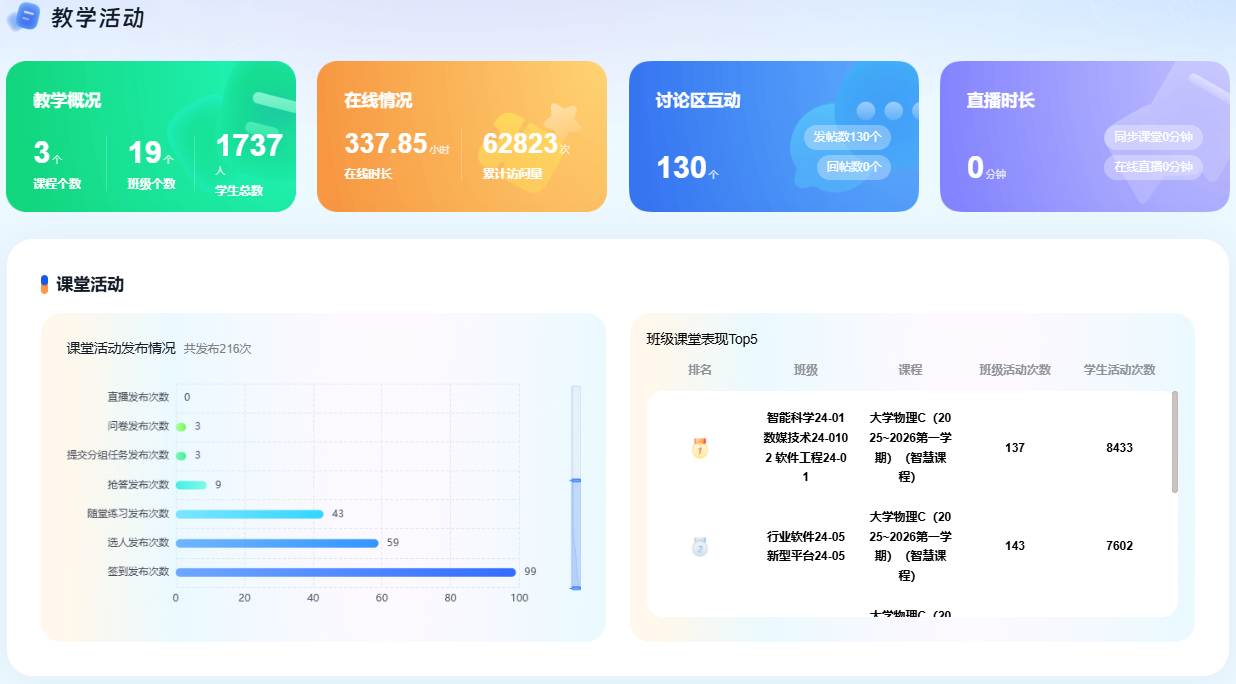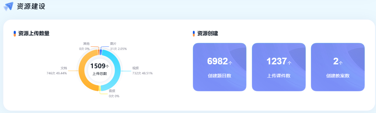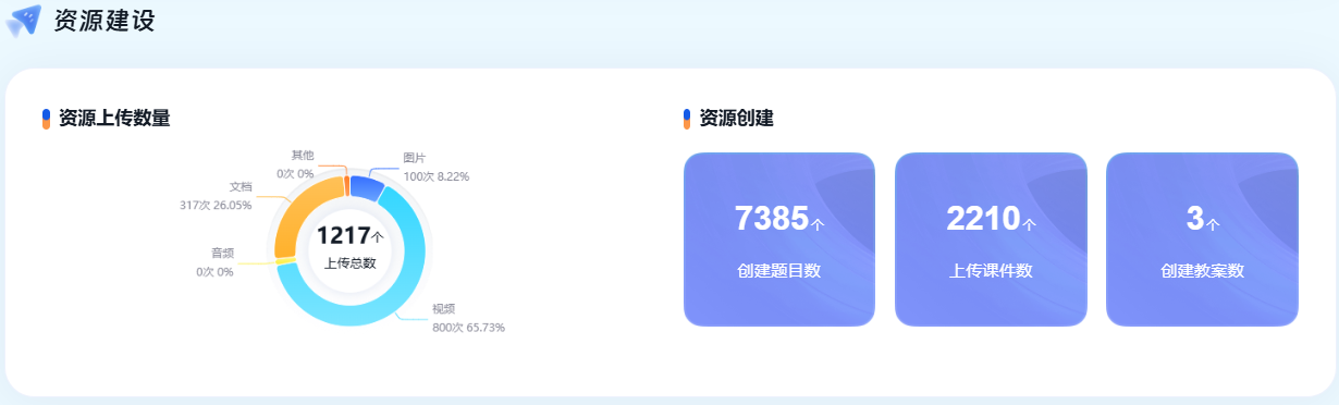 本学期教师累计上传资源79962个,创建题目219799道、作业2068个、试卷784份,丰富的资源储备不仅满足课堂教学需求,更支撑学生课外自主学习,通过资源共享机制有效提升了教学资源利用率,降低教师重复备课成本。