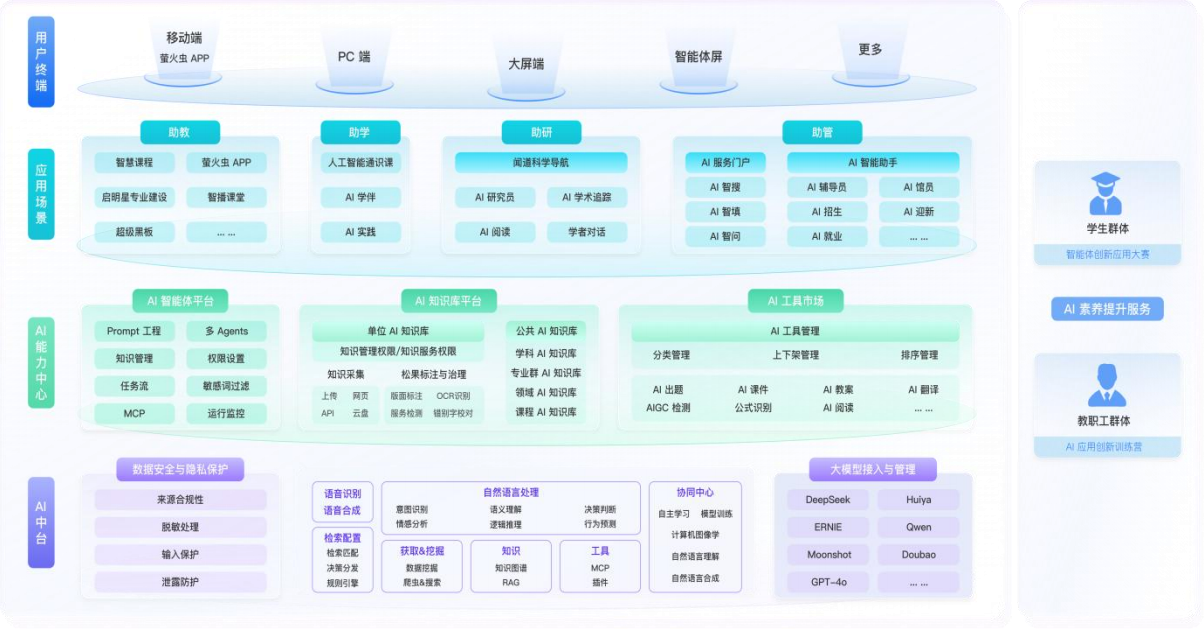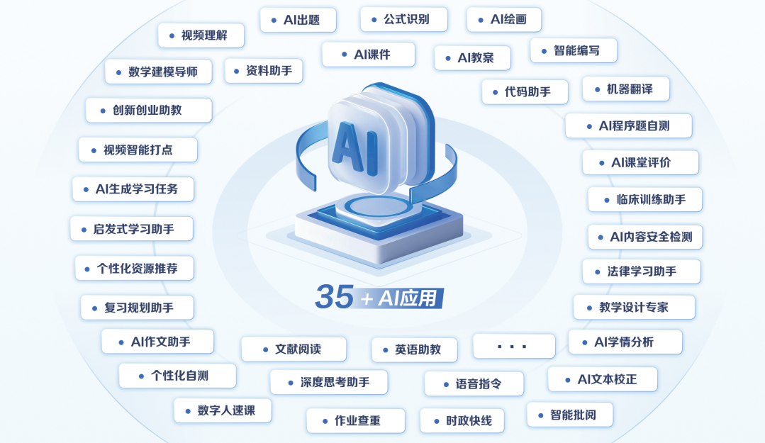 AI能力中心基于大语言模型、AI知识库RAG检索、AI工具的开放能力平台,为学校师生在教学、科研、阅读、就业、实习、管理和校园生活等多个场景提供智能化、个性化、便捷高效的AI服务和工具支持,这有助于学生、教师及教育管理者深入探索“人工智能+教育”的创新模式,充分挖掘并释放AI在教育领域中的巨大潜能和价值。