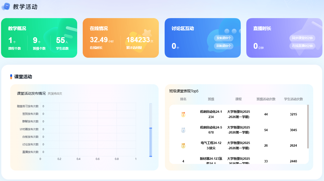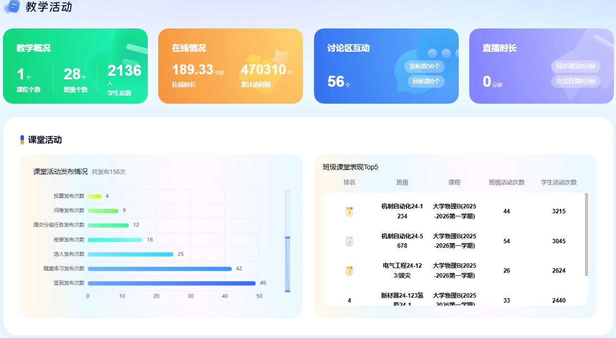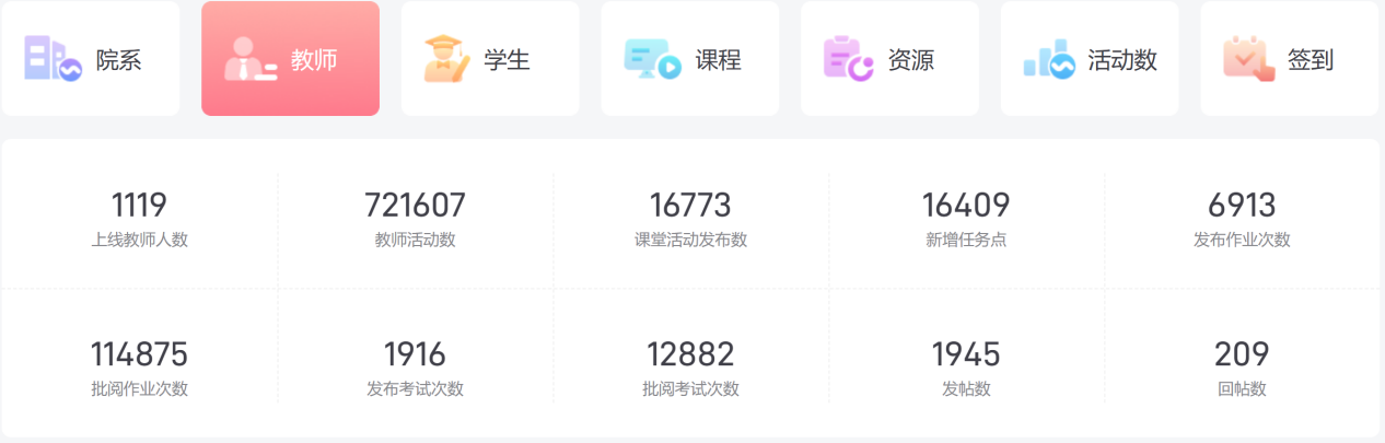 教师依托平台深度参与教学全流程,教学主动性与效率同步提升。本学期平台上线教师1119人,教师活动数发布数721607。教师课堂活动发布数16773;新增任务点16409;教师发布作业数6913,批阅作业数114875;教师发布考试数1916,批阅考试数12882;教师发起讨论1945次,回复讨论209次,主动搭建师生交流桥梁,推动教学从“课堂灌输”向“互动引导”转变,彰显智慧教学理念。