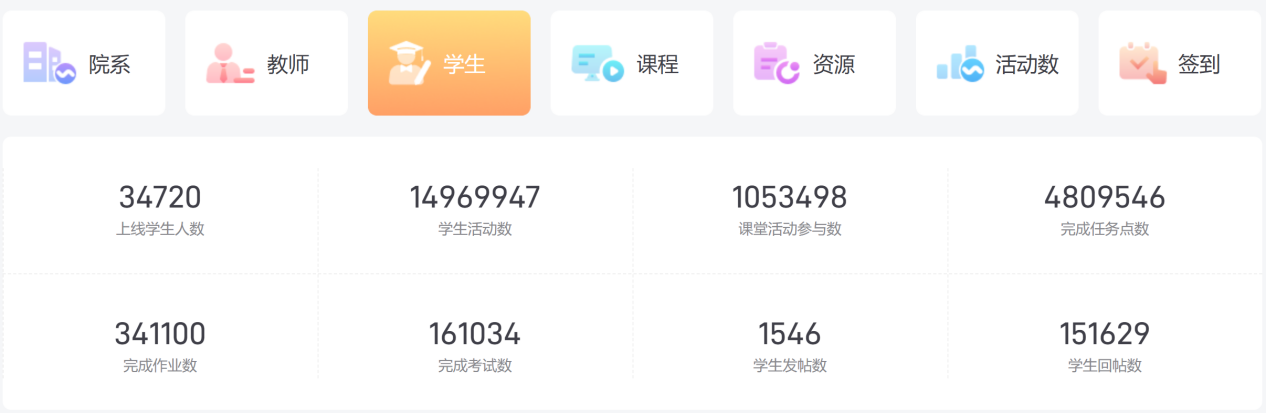 学生参与平台学习的积极性高涨,自主学习能力显著增强。本学期共上线学生34720人,学生共完成任务点数4809546人次。学生共参活动14969947人次;学生共参与课堂活动1053498人次;学生完成作业数341100人次,完成考试数161034人次;学生发起讨论1546个,回复讨论151629个,学生从“被动接受”转向“主动探究”,学习主体性凸显,形成良好的线上学习氛围。